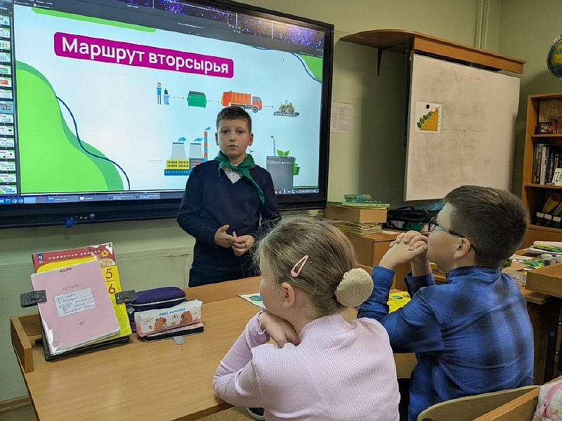 Наши волонтеры рассказывали школьникам о способах переработки мусора и важности формирования основ экологически грамотного поведения.